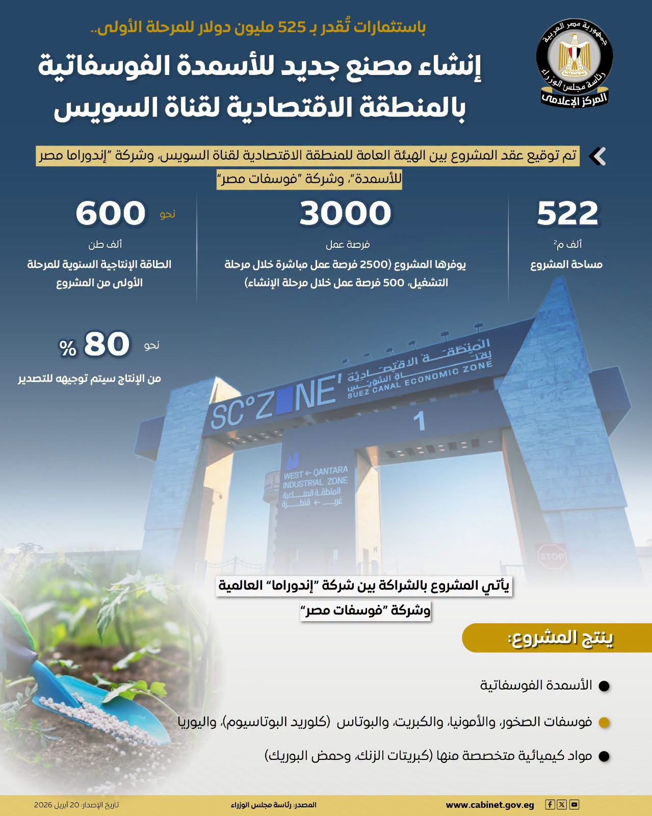 سلّط المركز الإعلامي لمجلس الوزراء الضوء على مشروع شركة إندوراما مصر للأسمدة بمنطقة السخنة الصناعية، باعتباره إضافة قوية لقطاع الصناعات الاستراتيجية، في إطار النجاحات المتواصلة للهيئة العامة للمنطقة الاقتصادية لقناة السويس في جذب الاستثمارات المتخصصة.