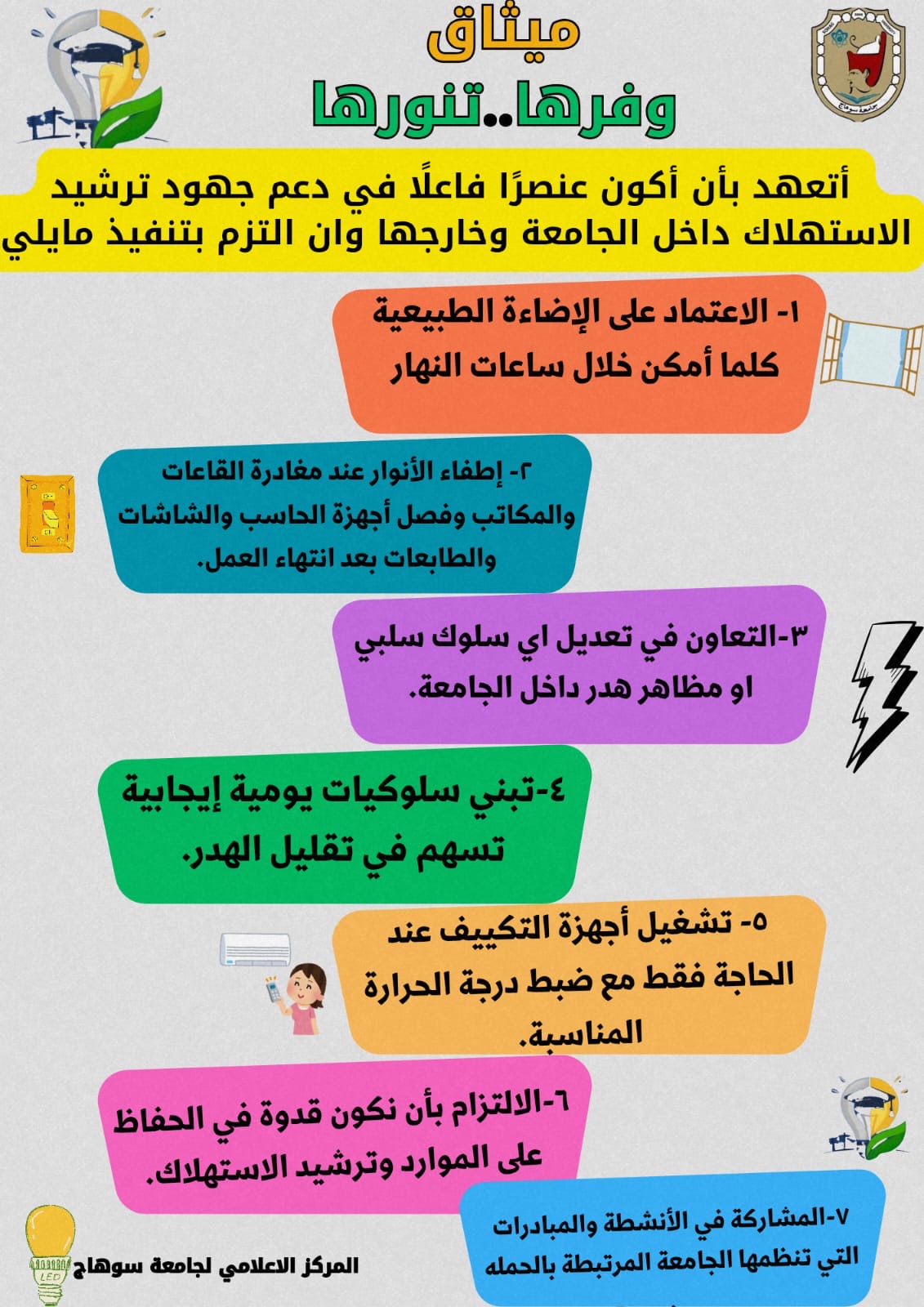 ويعكس ميثاق “وفرها.. تنورها” رؤية جامعة سوهاج في أن تكون نموذجًا مؤسسيًا رائدًا في الاستدامة البيئية، من خلال إشراك جميع منتسبيها في مسؤولية جماعية تهدف إلى بناء بيئة تعليمية واعية ومستدامة.